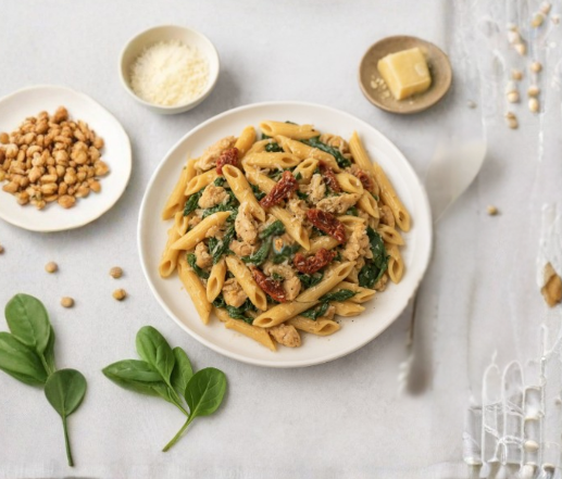 SZYBKI MAKARON Z INDYKIEM I SUSZONYMI POMIDORAMI — LEKKI, SYCIĄCY I IDEALNY PO 50-TCE
